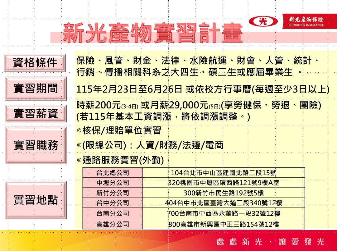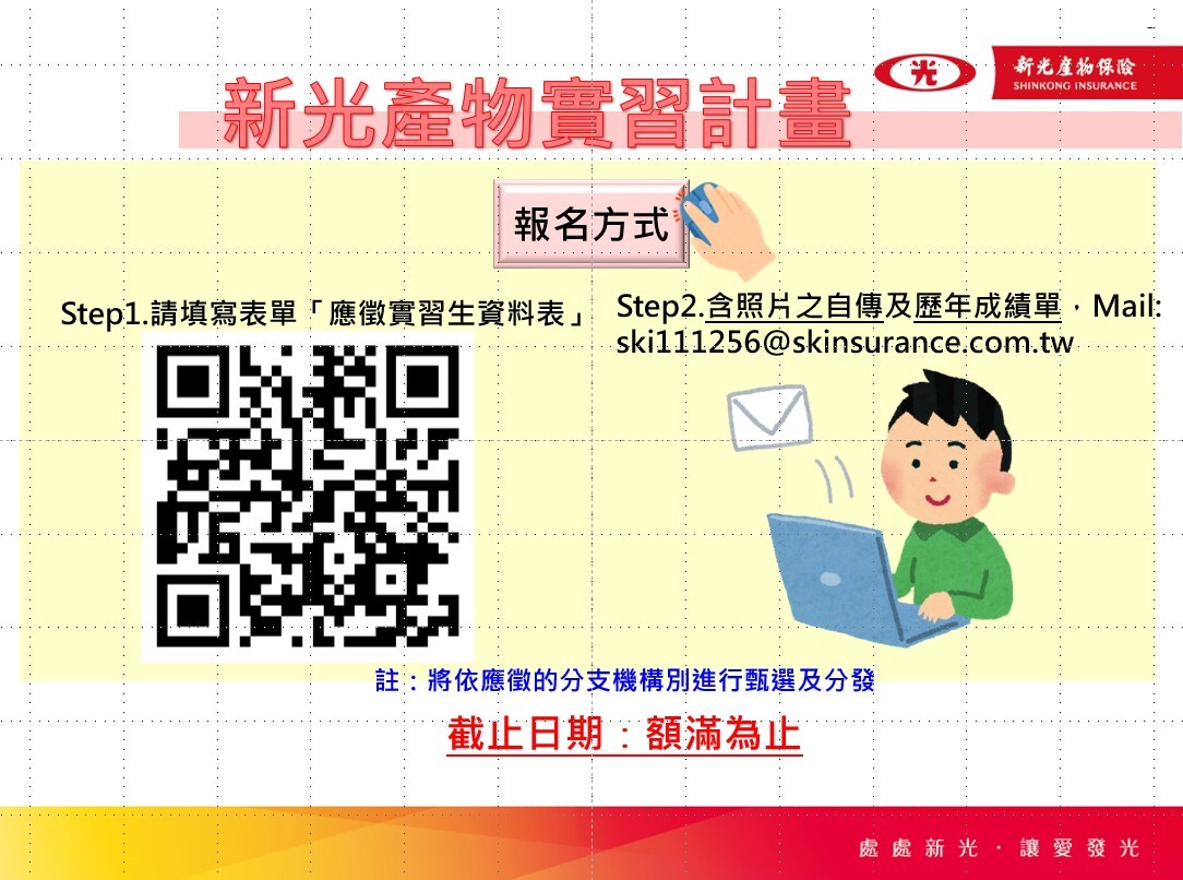 一、新光產物保險股份有限公司於115年2月23日至115年6月26日提供學期實習名額,歡迎有興趣學生報名參加。