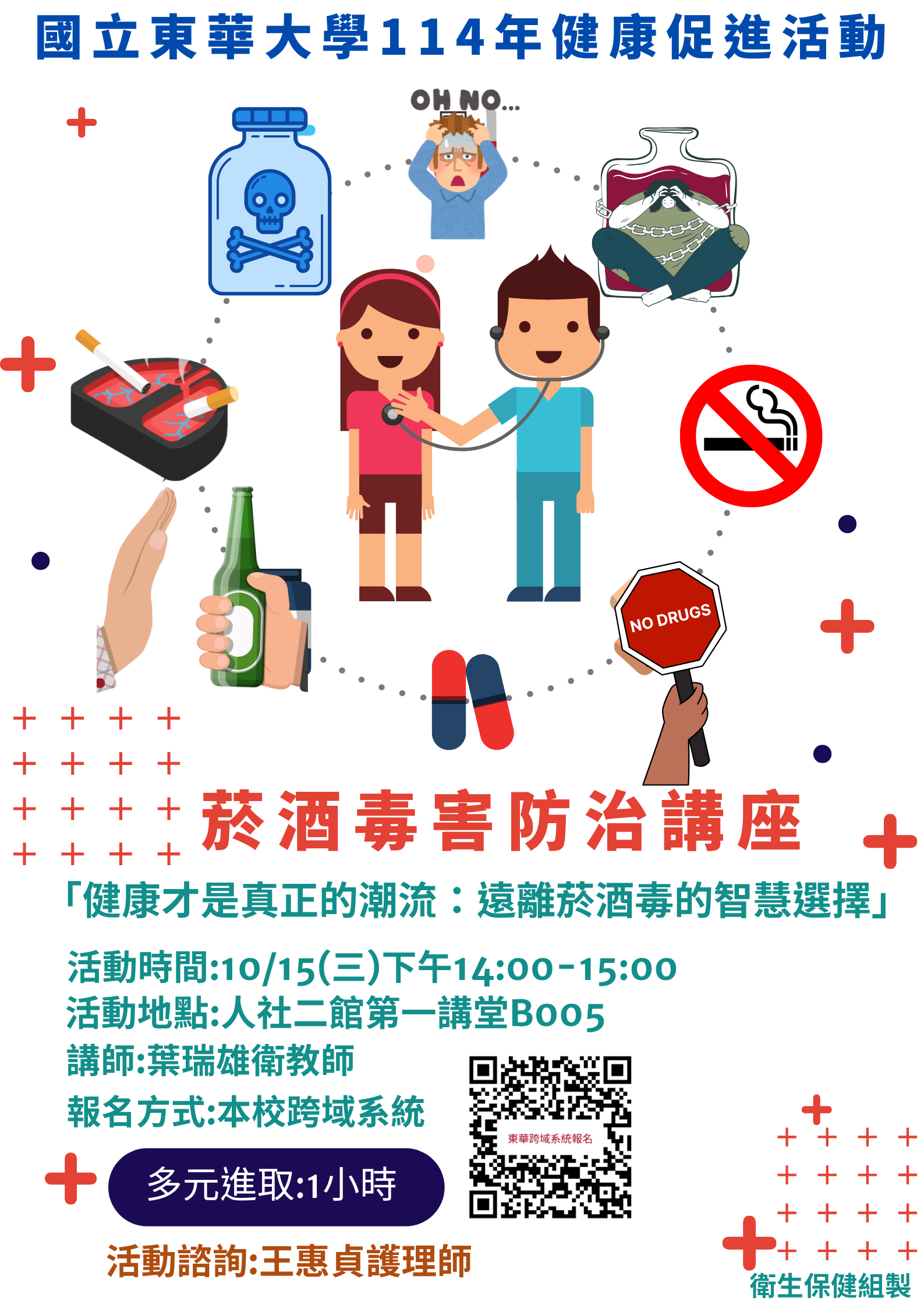 誠摯邀請您參加 「菸害.酒害.毒愛」健康講座,一起揭開菸、酒與毒品對身心健康的隱藏危機,並探索如何做出聰明又健康的選擇。