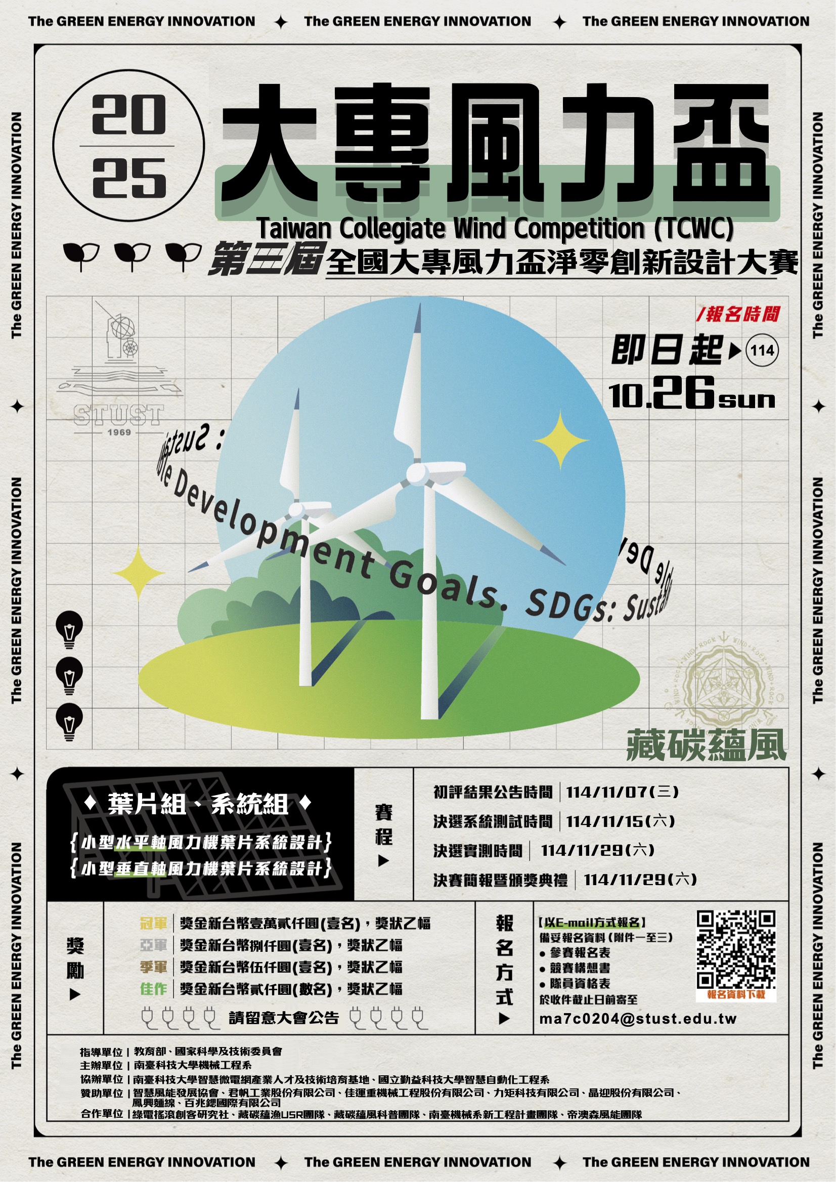 南臺學校財團法人南臺科技大學「2025第三屆全國大專風力盃淨零創新設計大賽Taiwan Collegiate Wind Competition (TCWC)」(原:第三屆南臺風力盃-綠電創能創意淨零實作競賽)