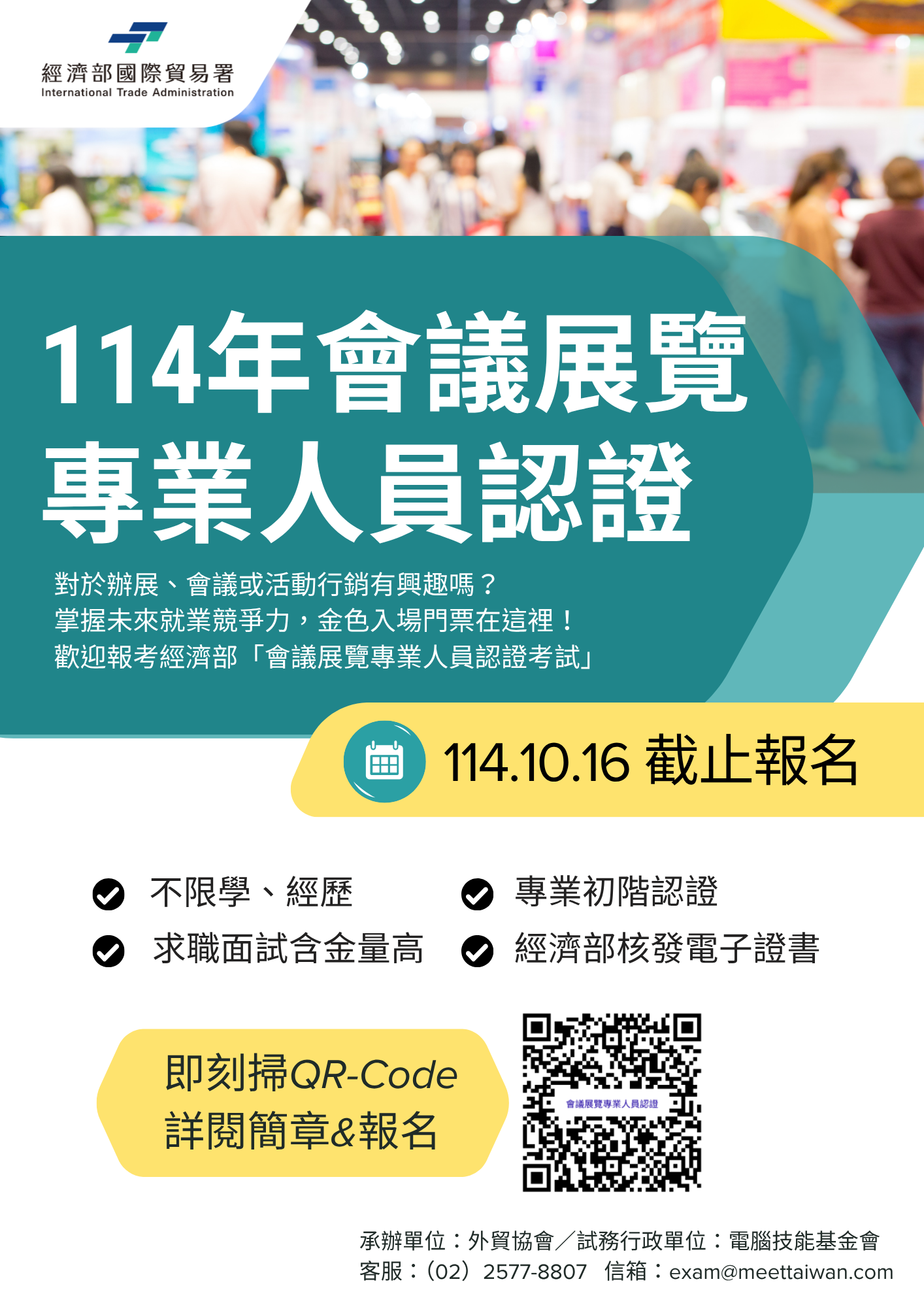 【就業/考試】114年會議展覽專業人員認證考試(114年10月16日截止)