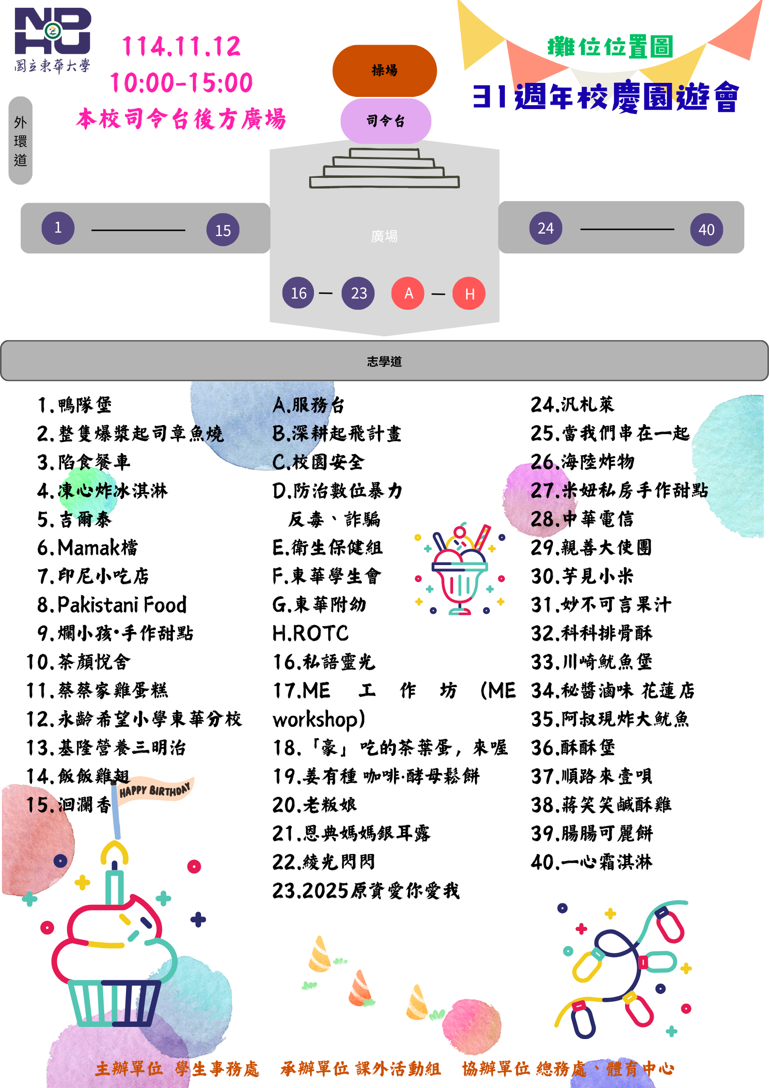 31週年校慶園遊會將於本校司令台後方廣場舉辦,讓您不論是在田徑場上全力衝刺,亦或是在場邊為激烈的賽事盡情吶喊,校慶園遊會都將是您補充體力好所在,滿滿的美食遊戲活動,邀請大家熱情參與!