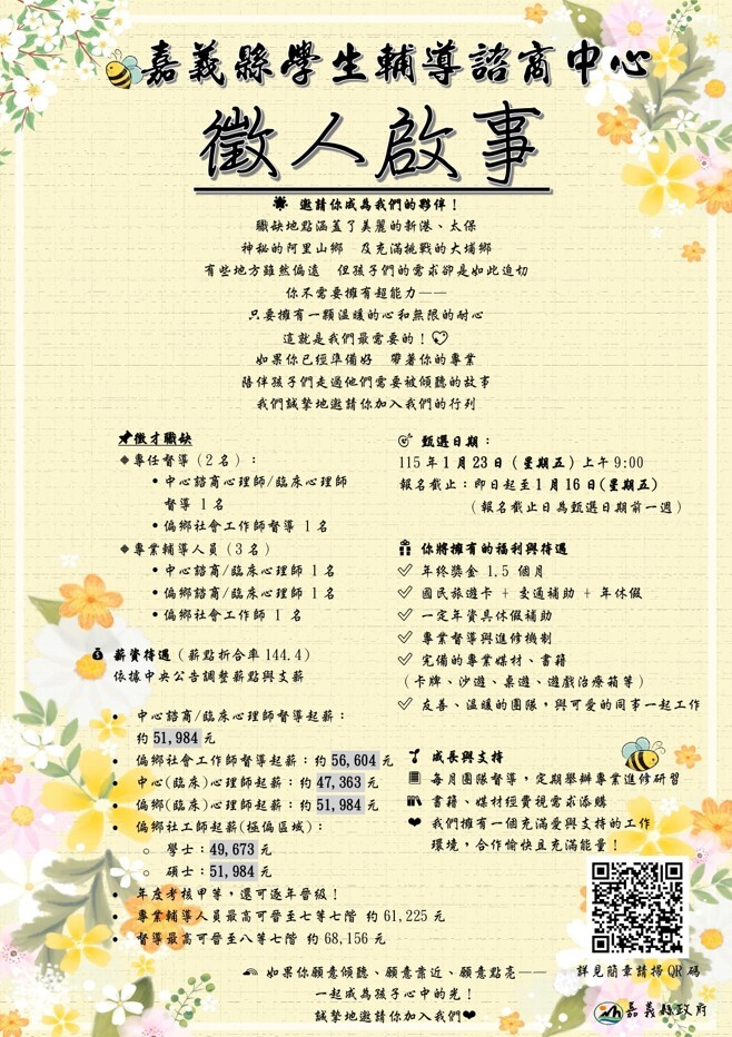 【徵才訊息】嘉義縣學生輔導諮商中心115年度第1次專任專業輔導人員甄選(心理師、社工師)(115年1月16日截止)