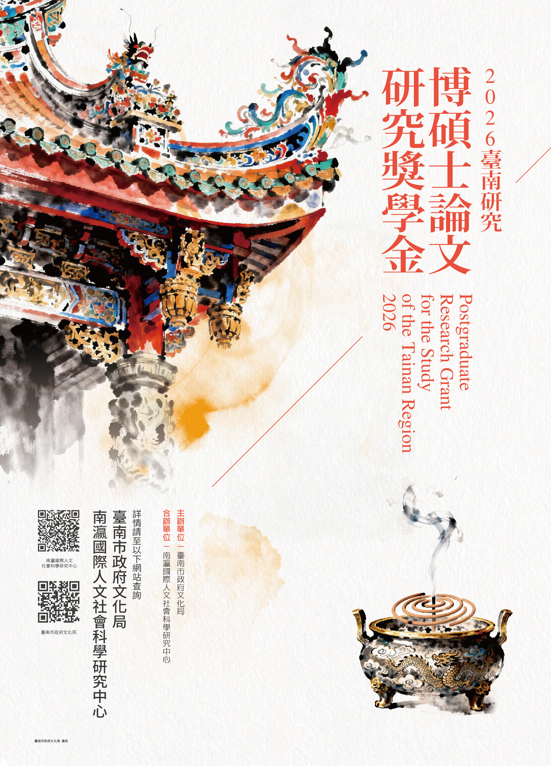 提供單位及獎助名稱:臺南市政府文化局「2026臺南研究博碩士論文研究獎學金」申請簡要說明: