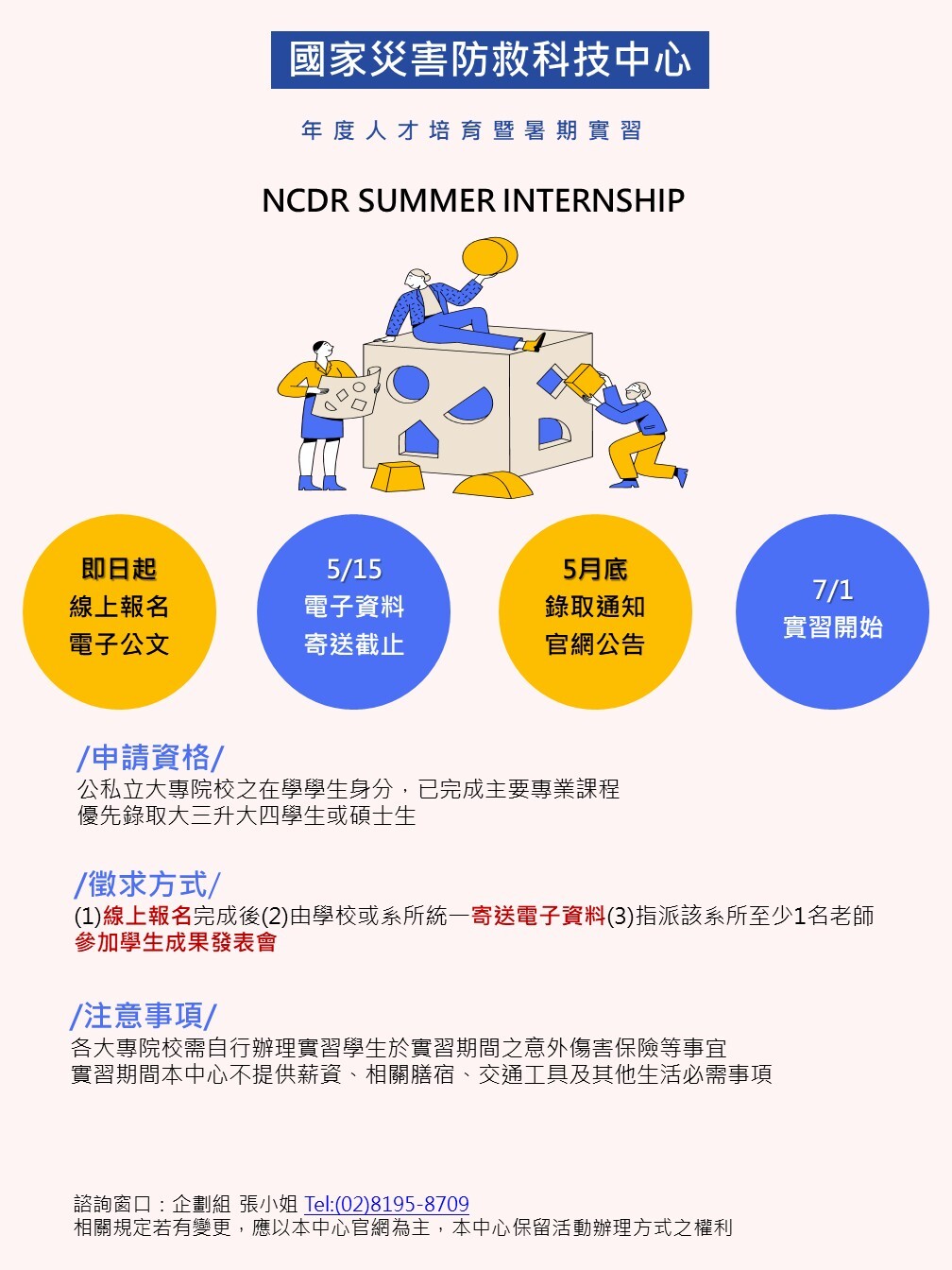 (四)諮詢窗口:如對人才培育暨暑期實習有疑問,歡迎聯繫災防中心企劃組張小姐 Tel: 02-8195-8709。